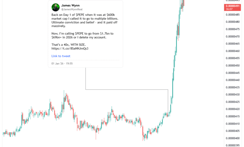 The famous meme coin PEPE surprised the crypto world on January 2, 2026 when its price jumped more than 20% in one day. This big move came right after a popular trader, James Wynn, made a very bold prediction for the future value of the coin.
